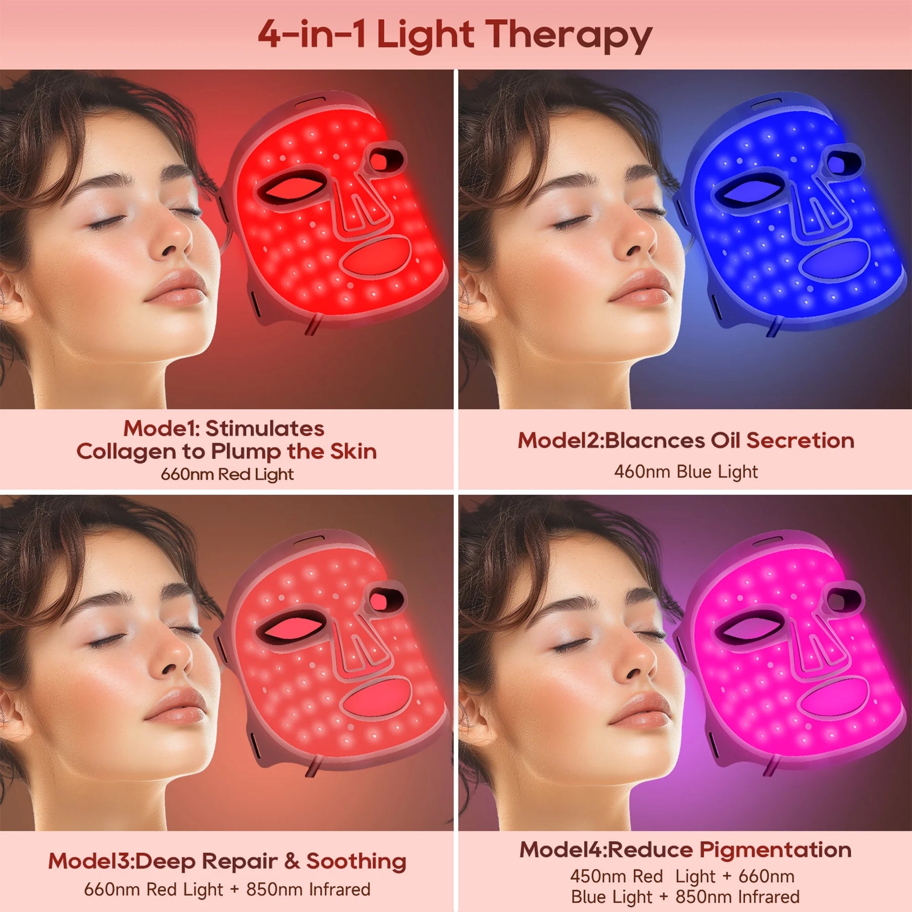 【4 Modes Red Light Therapy for Face】Infrared light (850nm) + Red light(620 nm), red light (620nm) , mixed light (850nm, 660nm and 460nm) and blue light (460nm) 4 light modes. The combination of red light and near-infrared light which is the best combination to increase skin elasticity and gloss. Mixed light can help balance oil secretion. Blue light helps improve skin redness. Red light mask has 3 levels of brightness, short press the switch key to adjust the brightness.